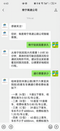 司乘只需關(guān)注“南寧高速公司”微信公眾號,點(diǎn)擊發(fā)消息即可輕松開啟在線咨詢之旅。這種將AI智能客服融入微信公眾號的方式,充分考慮了司乘人員的使用習(xí)慣,進(jìn)一步拉近了企業(yè)與司乘之間的距離。